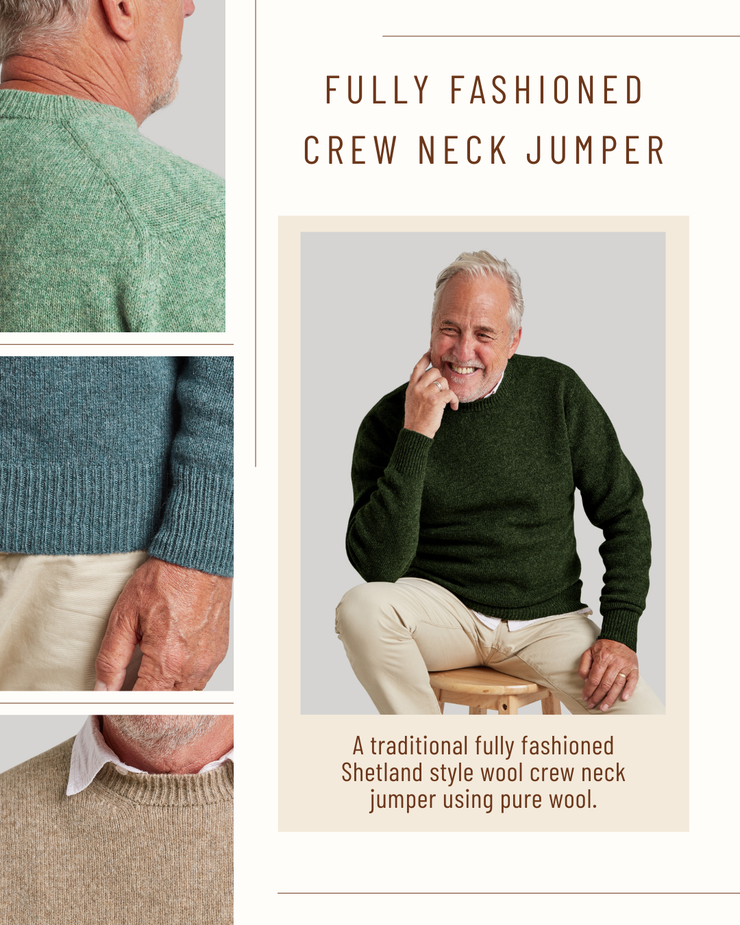 Fully Fashioned Shetland Crew Neck Jumper in Dark Olive