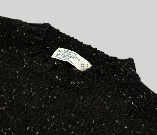 Chunky Donegal Wool Crew Neck Jumper in Black Tweed