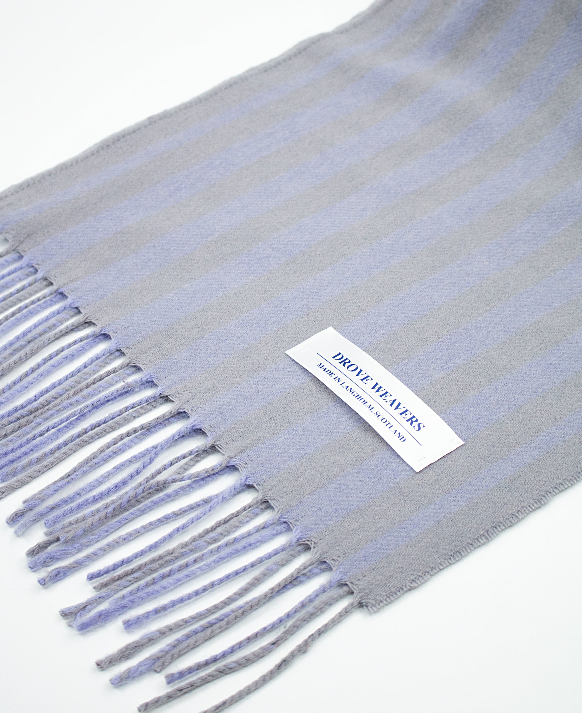 A must-have for any wardrobe, our 50% Cashmere 50% Geelong scarf in a purple and grey stripe design is the perfect complement to any outfit. Expertly crafted from pure wool with a subtle fringed trim, it is woven in Langholm, Scotland.