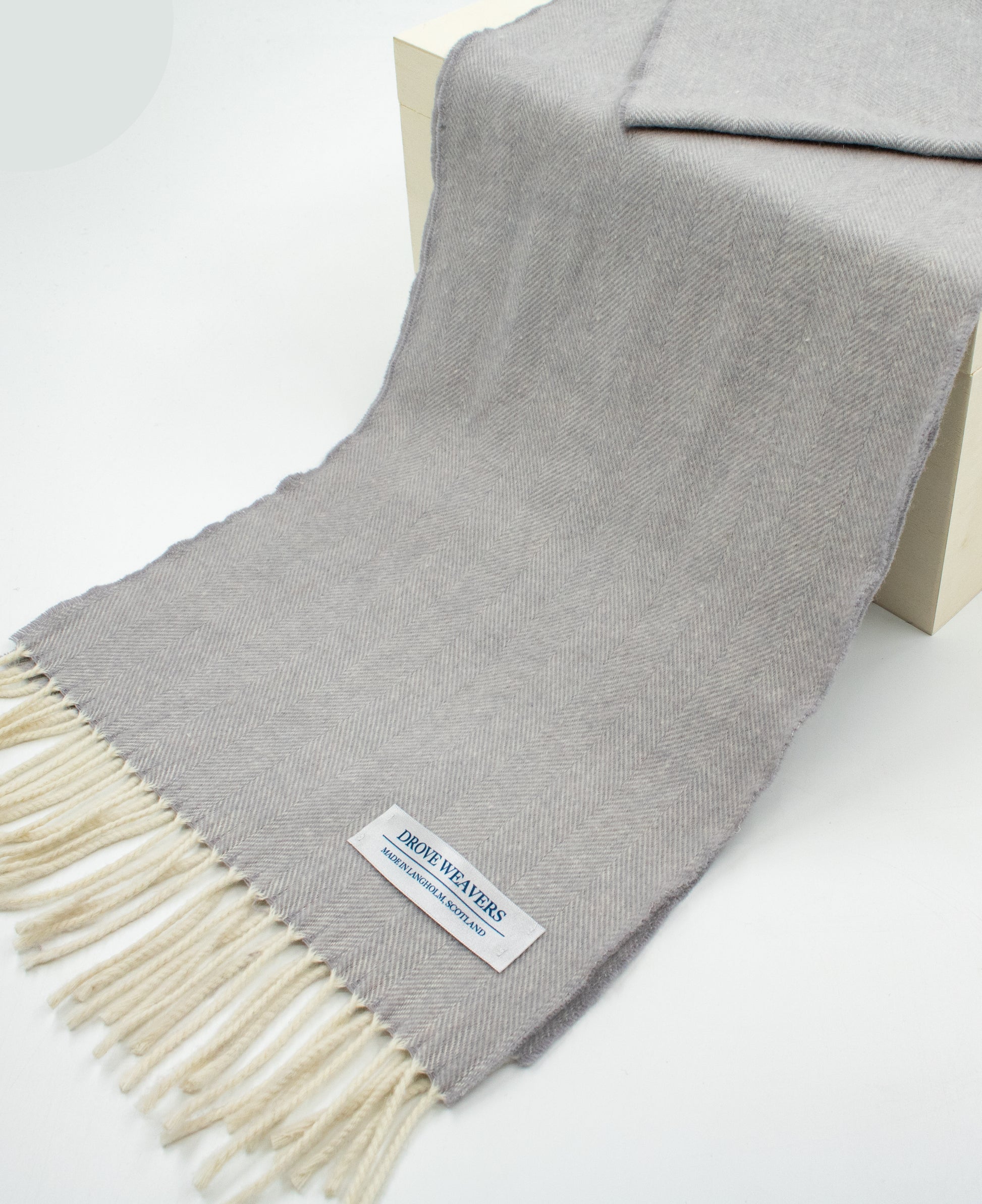 An essential addition to any wardrobe, our 50% Cashmere, 50% Geelong herringbone scarf perfectly complements any outfit. Crafted entirely from pure wool and minimally adorned with a fringed trim. Made in Langholm, Scotland